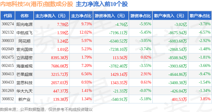 资金流向方面,内地科技50(港币)(983004)指数成份股当日主力资金净流出合计7.8亿元,游资资金净流出合计1.27亿元,散户资金净流入合计9.07亿元。成份股资金流向详情见下表:
