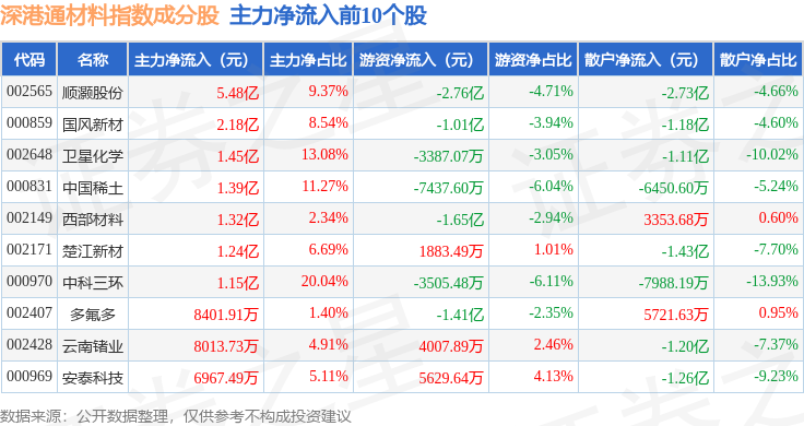 资金流向方面,深港通材料(983015)指数成份股当日主力资金净流出合计24.86亿元,游资资金净流出合计2.87亿元,散户资金净流入合计27.73亿元。成份股资金流向详情见下表: