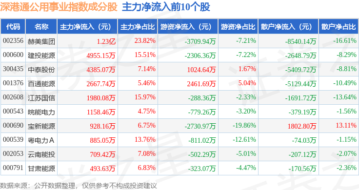 资金流向方面,深港通公用事业(983031)指数成份股当日主力资金净流入合计3206.27万元,游资资金净流入合计950.41万元,散户资金净流出合计4156.68万元。成份股资金流向详情见下表: