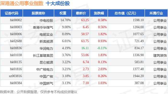 深港通公用事业(983031)指数十大成份股详情如下: