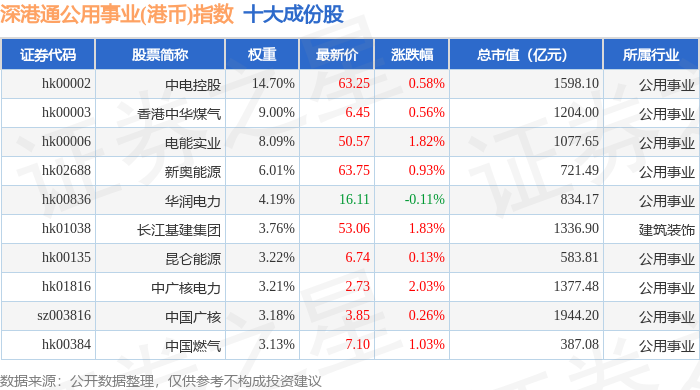 深港通公用事业(港币)(983032)指数十大成份股详情如下: