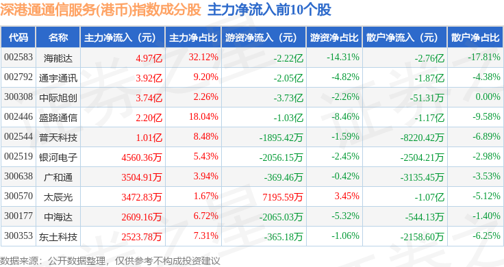 资金流向方面,深港通通信服务(港币)(983034)指数成份股当日主力资金净流出合计20.72亿元,游资资金净流入合计7.71亿元,散户资金净流入合计13.01亿元。成份股资金流向详情见下表: