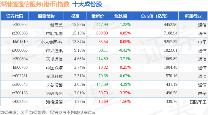 深港通通信服务(港币)(983034)指数十大成份股详情如下:
