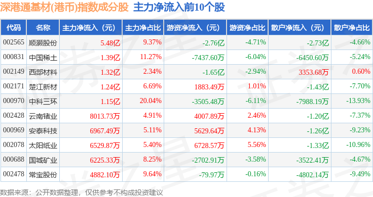 资金流向方面,深港通基材(港币)(983062)指数成份股当日主力资金净流出合计16.63亿元,游资资金净流入合计2977.23万元,散户资金净流入合计16.33亿元。成份股资金流向详情见下表: