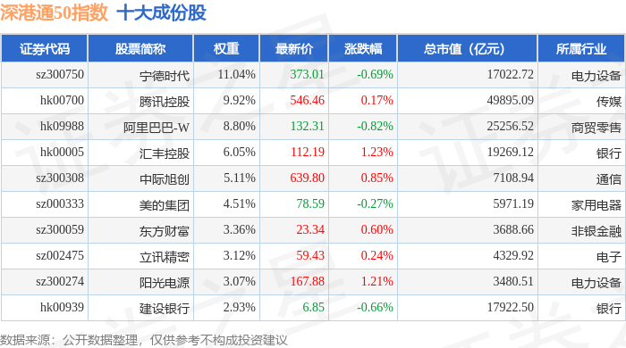 证券之星消息,12月25日,深港通50(983091)指数报收于2010.86点,跌0.03%,成交748.81亿元,换手率0.89%。当日该指数成份股中,上涨的有30家,中芯国际以3.12%的涨幅领涨,下跌的有18家,胜宏科技以3.16%的跌幅领跌。