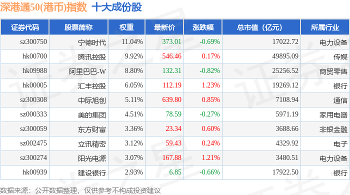 深港通50(港币)(983092)指数十大成份股详情如下: