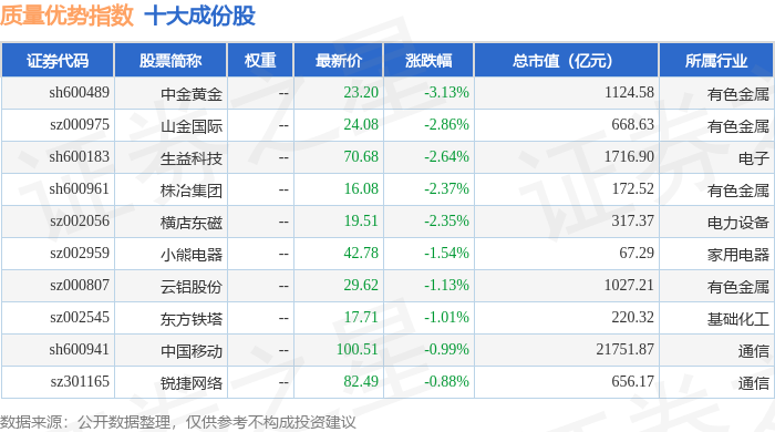 质量优势(989017)指数十大成份股详情如下: