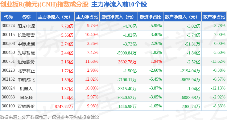 资金流向方面,创业板R(美元)(CNH)(470007)指数成份股当日主力资金净流出合计28.74亿元,游资资金净流入合计8.11亿元,散户资金净流入合计20.63亿元。成份股资金流向详情见下表: