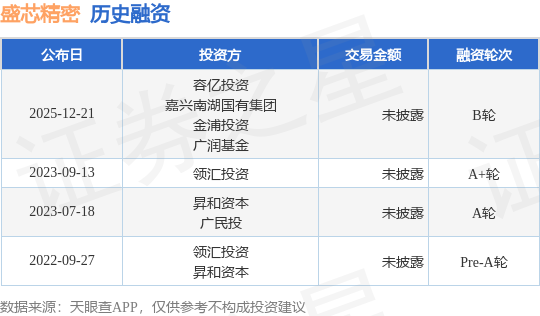 证券之星消息,根据天眼查APP于12月21日公布的信息整理,苏州盛芯精密科技有限公司B轮融资,融资额未披露,参与投资的机构包括容亿投资,嘉兴南湖国有集团,金浦投资,广润基金。