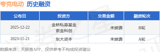 证券之星消息,根据天眼查APP于12月22日公布的信息整理,南京夸克电动科技有限责任公司B轮融资,融资额未披露,参与投资的机构包括金桥私募基金,紫金科创。