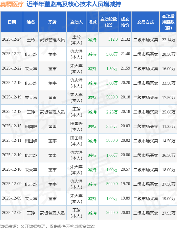 奥精医疗近半年内的董监高及核心技术人员增减持详情如下: