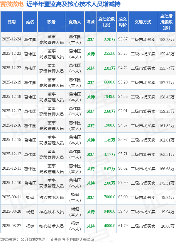 赛微微电近半年内的董监高及核心技术人员增减持详情如下: