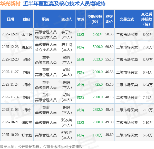 华光新材近半年内的董监高及核心技术人员增减持详情如下: