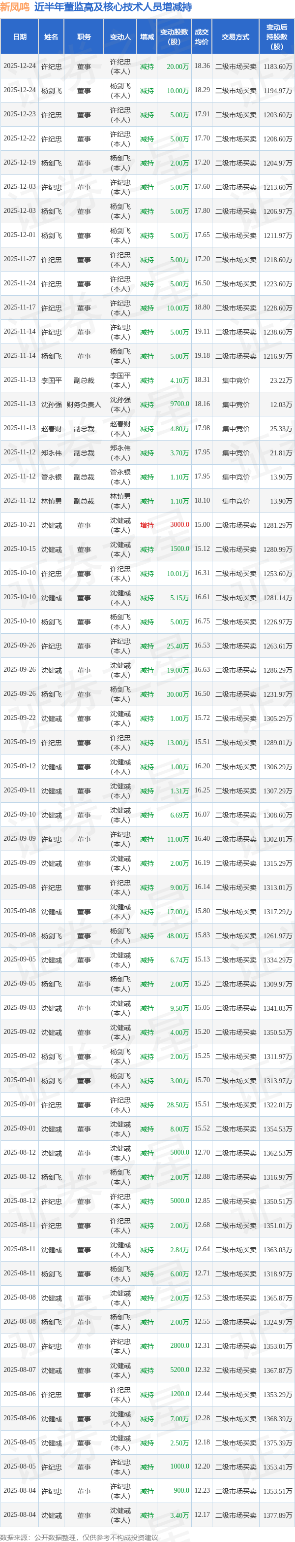 证券之星消息,根据12月25日市场公开信息、上市公司公告及交易所披露数据整理,新凤鸣(603225)最新董监高及相关人员股份变动情况:2025年12月24日公司董事许纪忠、董事杨剑飞共减持公司股份30.0万股,占公司总股本为0.0197%。变动期间公司股价上涨3.63%,12月24日当日收盘报18.29元。