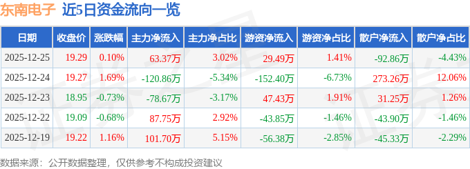 证券之星消息,截至2025年12月25日收盘,东南电子(301359)报收于19.29元,上涨0.1%,换手率1.59%,成交量1.09万手,成交额2097.54万元。