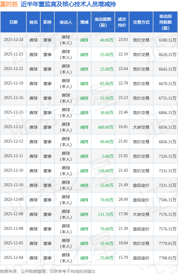 赢时胜近半年内的董监高及核心技术人员增减持详情如下:
