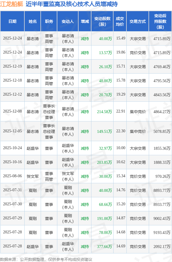 江龙船艇近半年内的董监高及核心技术人员增减持详情如下: