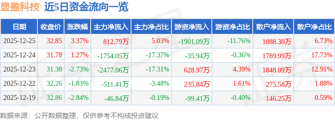 证券之星消息,截至2025年12月25日收盘,显盈科技(301067)报收于32.85元,上涨3.37%,换手率7.81%,成交量4.99万手,成交额1.62亿元。