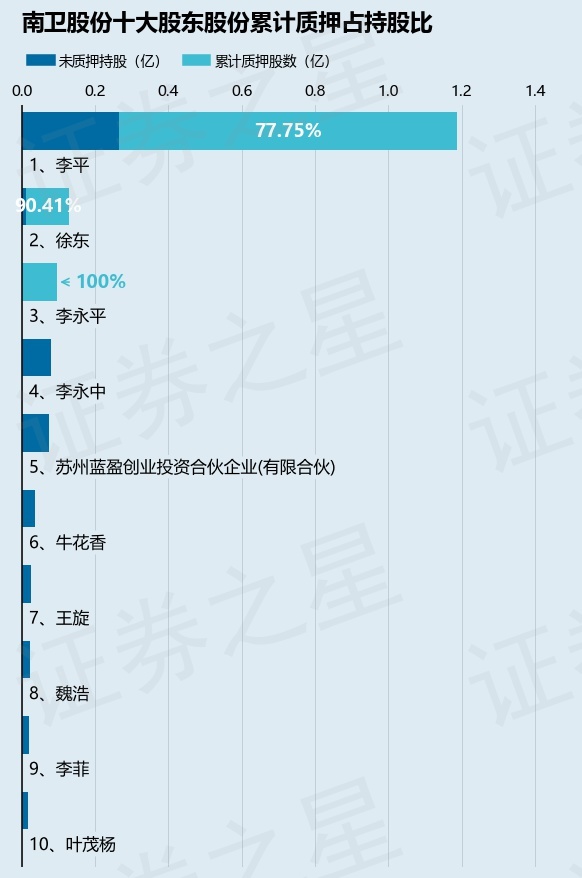 截止本公告日,股东李平已累计质押股份9240.0万股,占其持股总数的77.75%,股东徐东已累计质押股份1170.0万股,占其持股总数的90.41%,股东李永平已累计质押股份963.93万股,占其持股总数的100.0%。本次质押后南卫股份十大股东的累计质押股份占持股比例(占持股比例的计算以公司最新一期财务报表公布的十大股东的持股总数为基准)见下图: