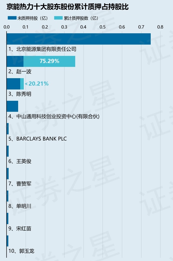 截止本公告日,股东赵一波已累计质押股份2691.66万股,占其持股总数的75.29%,股东陈秀明已累计质押股份182.0万股,占其持股总数的20.21%。本次质押后京能热力十大股东的累计质押股份占持股比例(占持股比例的计算以公司最新一期财务报表公布的十大股东的持股总数为基准)见下图: