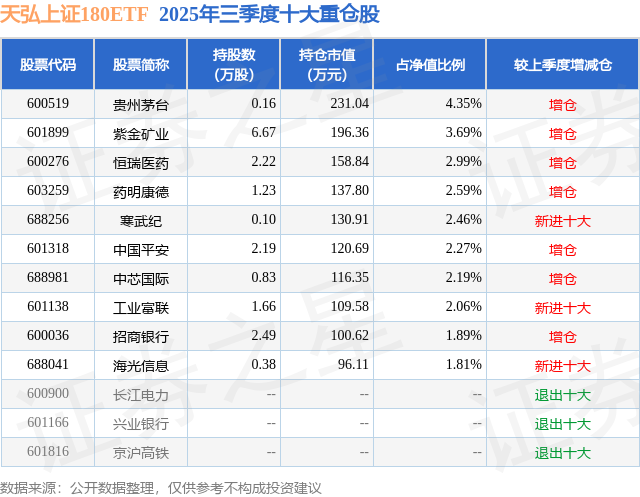 天弘上证180ETF基金成立于2025年1月8日,基金经理为张戈,基金跟踪标的为上证180指数,成立以来超额回报为2.44%,近一个月超额回报为0.0%。最新披露的基金持仓数据显示,截止2025年9月30日,该基金第一大重仓股为贵州茅台(600519),持股占比为4.35%。