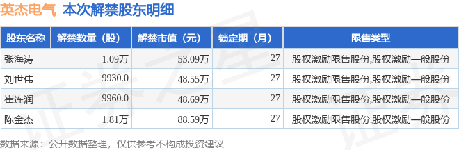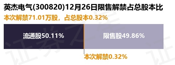 证券之星消息,根据市场公开信息整理,英杰电气(300820)于12月26日将有71.01万股限售股份解禁,为公司股权激励限售股份,股权激励一般股份,占公司总股本0.32%。(本次数据根据历史公告整理得出,实际情况以上市公司最新公告为准)本次解禁后,公司还有1.11亿股限售股份,占总股本49.86%。具体如下图所示: