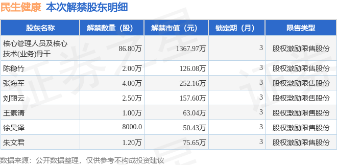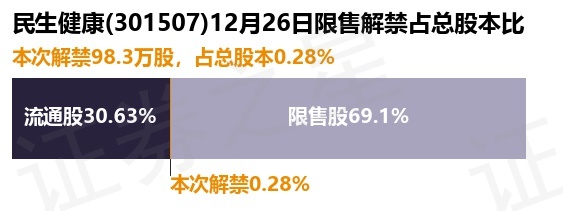 证券之星消息,根据市场公开信息整理,民生健康(301507)于12月26日将有98.3万股限售股份解禁,为公司股权激励限售股份,占公司总股本0.28%。(本次数据根据历史公告整理得出,实际情况以上市公司最新公告为准)本次解禁后,公司还有2.46亿股限售股份,占总股本69.1%。具体如下图所示: