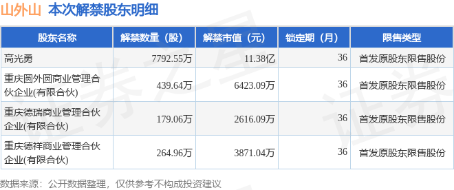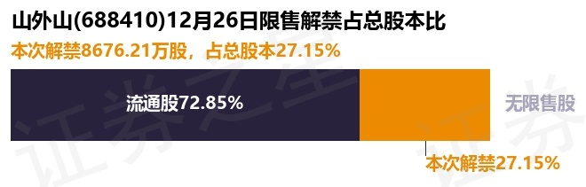 证券之星消息,根据市场公开信息整理,山外山(688410)于12月26日将有8676.21万股限售股份解禁,为公司首发原股东限售股份,占公司总股本27.15%。(本次数据根据历史公告整理得出,实际情况以上市公司最新公告为准)最近一年内,该股累计解禁321.38万股,占总股本的1.01%。本次解禁后,公司已无限售股份。具体如下图所示: