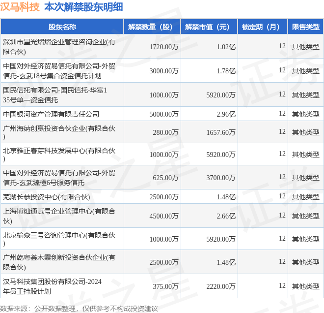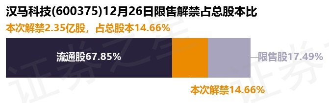 证券之星消息,根据市场公开信息整理,汉马科技(600375)于12月26日将有2.35亿股限售股份解禁,为公司其他类型,占公司总股本14.66%。(本次数据根据历史公告整理得出,实际情况以上市公司最新公告为准)本次解禁后,公司还有2.8亿股限售股份,占总股本17.49%。具体如下图所示: