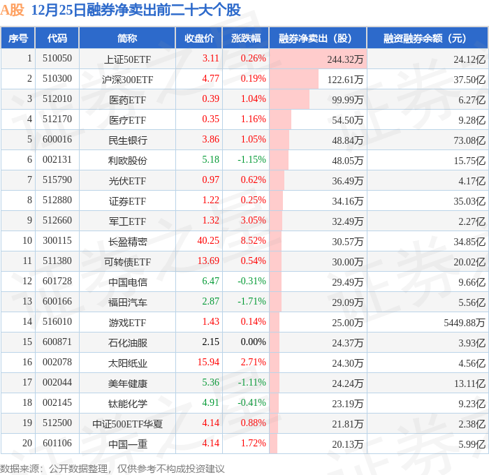 A股融券净卖出前三分别为:上证50ETF(510050)融券净卖出244.32万股、沪深300ETF(510300)融券净卖出122.61万股、医药ETF(512010)融券净卖出99.99万股,前20具体见下表: