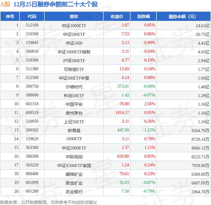 A股融券余额前三分别为:中证1000ETF(512100)融券余额24.61亿元、中证500ETF(510500)融券余额20.75亿元、中证1000(159845)融券余额4.41亿元,前20具体见下表: