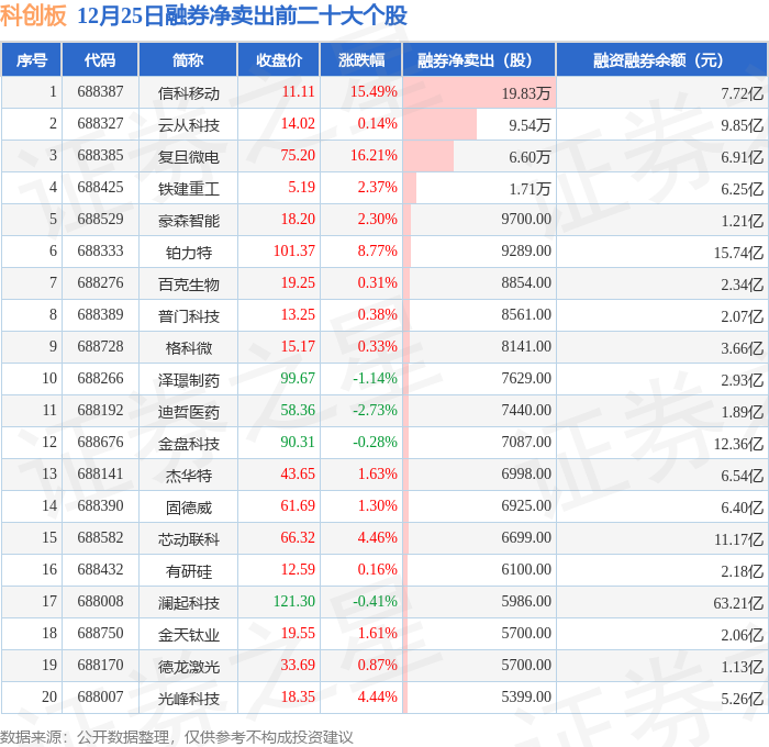 科创板融券净卖出前三分别为:信科移动(688387)融券净卖出19.83万股、云从科技(688327)融券净卖出9.54万股、复旦微电(688385)融券净卖出6.6万股,前20具体见下表: