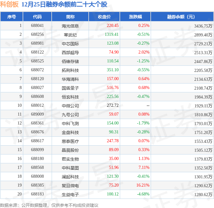 科创板融券余额前三分别为:海光信息(688041)融券余额3436.75万元、寒武纪(688256)融券余额2899.4万元、中芯国际(688981)融券余额2729.21万元,前20具体见下表: