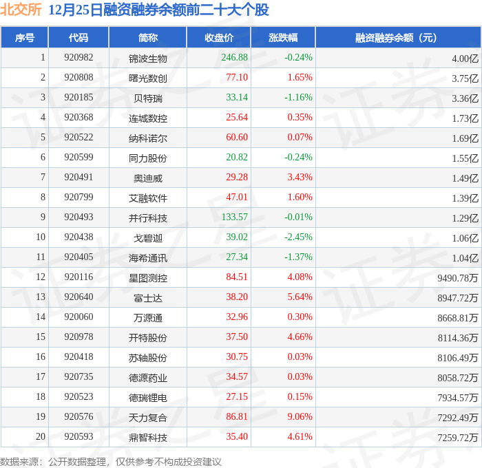 北交所融资融券余额前三分别为:锦波生物(920982)融资融券余额4亿元、曙光数创(920808)融资融券余额3.75亿元、贝特瑞(920185)融资融券余额3.36亿元,前20具体见下表: