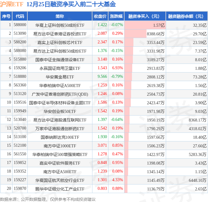 沪深ETF融资净买入前三分别为:华夏上证科创板50成份ETF(588000)融资净买入1.57亿元、易方达中证香港证券投资ETF(513090)融资净买入8388.68万元、嘉实上证科创板芯片ETF(588200)融资净买入3353.44万元,前20具体见下表: