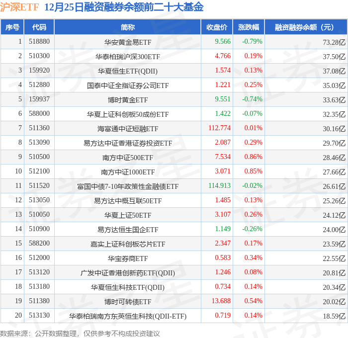 沪深ETF融资融券余额前三分别为:华安黄金易ETF(518880)融资融券余额73.28亿元、华泰柏瑞沪深300ETF(510300)融资融券余额37.5亿元、华夏恒生ETF(QDII)(159920)融资融券余额37.08亿元,前20具体见下表: