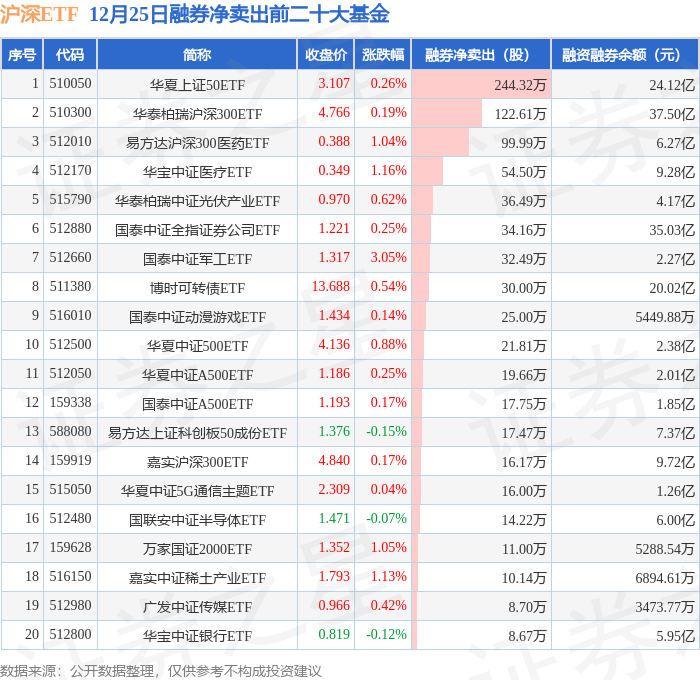 沪深ETF融券净卖出前三分别为:华夏上证50ETF(510050)融券净卖出244.32万股、华泰柏瑞沪深300ETF(510300)融券净卖出122.61万股、易方达沪深300医药ETF(512010)融券净卖出99.99万股,前20具体见下表:
