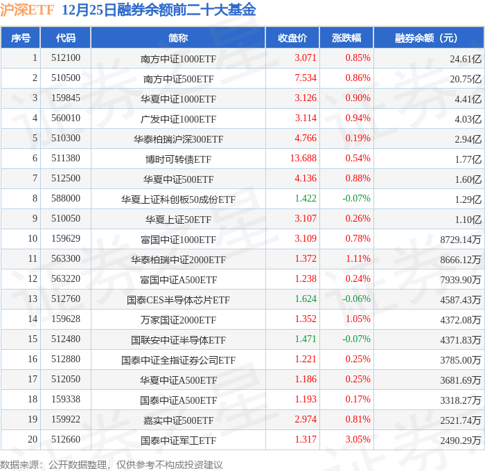 沪深ETF融券余额前三分别为:南方中证1000ETF(512100)融券余额24.61亿元、南方中证500ETF(510500)融券余额20.75亿元、华夏中证1000ETF(159845)融券余额4.41亿元,前20具体见下表: