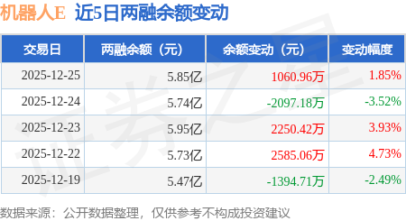 证券之星消息,12月25日,机器人E(159530)融资买入7436.42万元,融资偿还6375.46万元,融资净买入1060.96万元,融资余额5.85亿元,近20个交易日中有12个交易日出现融资净买入。