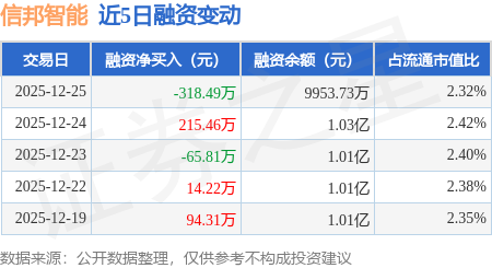 证券之星消息,12月25日,信邦智能(301112)融资买入304.8万元,融资偿还623.3万元,融资净卖出318.49万元,融资余额9953.73万元。