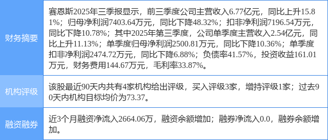 2025年11月1日,东吴证券研究员袁理,谷玥发布了对赛恩斯的研报《2025年三季报点评:业绩受累于费用&减值,拟发行可转债扩产药剂》,该研报对赛恩斯给出“买入”评级。证券之星数据中心根据近三年发布的研报数据计算,该研报作者对此股的盈利预测准确度为81.15%。