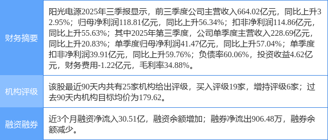2025年11月10日,华安证券研究员张志邦发布了对阳光电源的研报《盈利高增,单季毛利率创年内新高》,该研报对阳光电源给出“买入”评级。研报中预计公司2025-2027年归母净利润分别为154.5/183.4/206.0亿元(前值分别为149/160/178亿元),对应PE27/23/20x,维持“买入”评级。证券之星数据中心根据近三年发布的研报数据计算,该研报作者对此股的盈利预测准确度为94.27%。