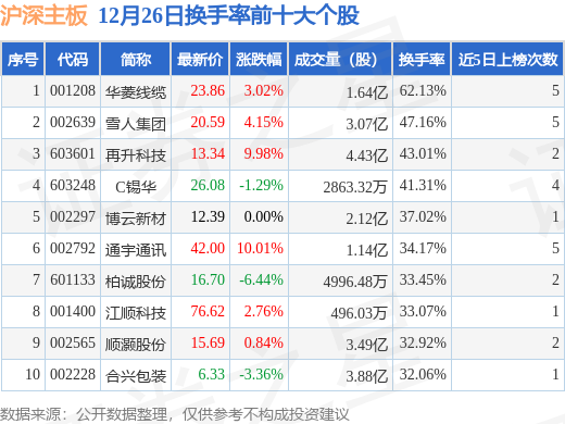 当日沪深主板换手率前10大个股中6只个股收涨,平均涨幅5.13%,其中华菱线缆(001208)以换手率62.13%排第一,7只个股近5个交易日中多次上榜。