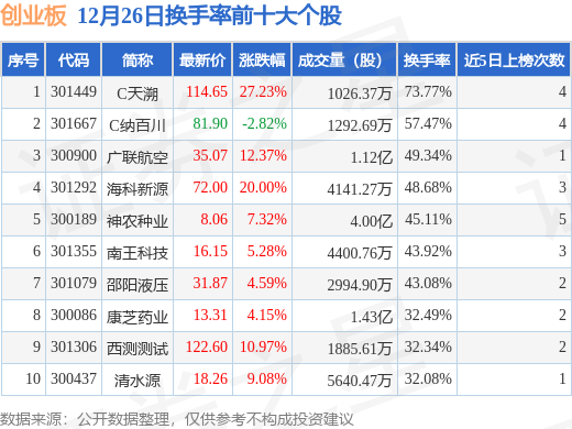 当日创业板换手率前10大个股中9只个股收涨,平均涨幅11.22%,其中C天溯(301449)以换手率73.77%排第一,8只个股近5个交易日中多次上榜。