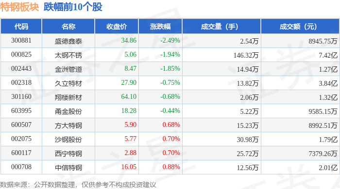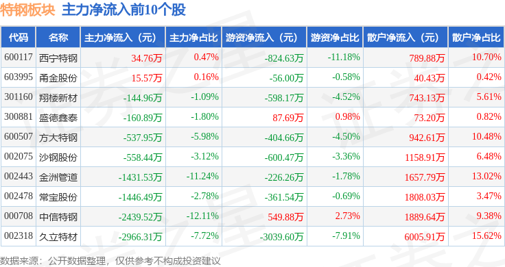 从资金流向上来看,当日特钢板块主力资金净流出2.37亿元,游资资金净流出3418.39万元,散户资金净流入2.71亿元。特钢板块个股资金流向见下表: