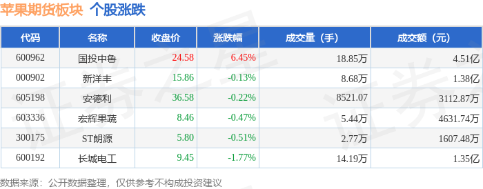 证券之星消息,12月26日苹果期货板块较上一交易日上涨0.5%,国投中鲁领涨。当日上证指数报收于3963.68,上涨0.1%。深证成指报收于13603.89,上涨0.54%。苹果期货板块个股涨跌见下表: