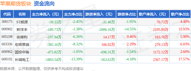 从资金流向上来看,当日苹果期货板块主力资金净流出3091.52万元,游资资金净流出3177.31万元,散户资金净流入6268.83万元。苹果期货板块个股资金流向见下表: