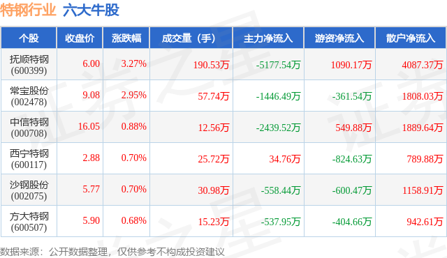 个股表现方面,特钢行业当日领涨股为抚顺特钢(600399),该股当日报收6.0,上涨3.27%,成交量190.53万,主力资金净流出5177.54万元。常宝股份(002478)以上涨2.95%紧随其后,该股当日成交量57.74万,主力资金净流出1446.49万元。除此之外,中信特钢(000708)、西宁特钢(600117)、沙钢股份(002075)均进入当日牛股之列。具体个股列表见下表: