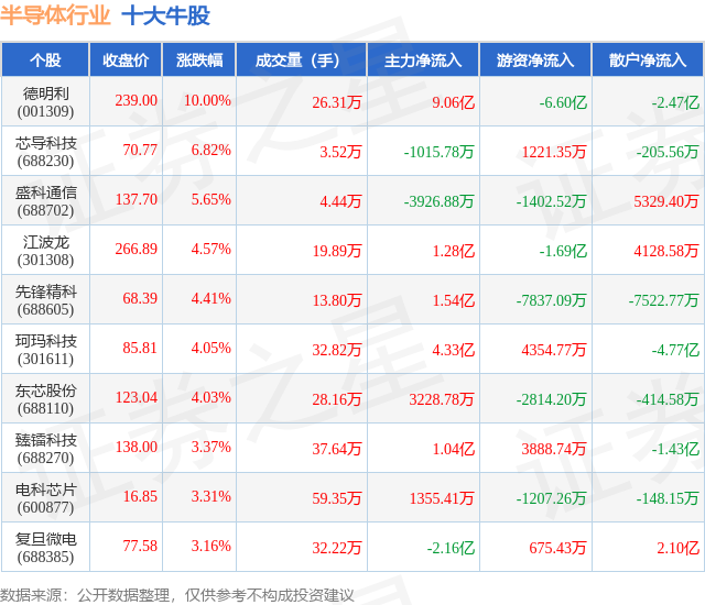 个股表现方面,半导体行业当日领涨股为德明利(001309),该股当日报收239.0,上涨10.0%,成交量26.31万,主力资金净流入9.06亿元。芯导科技(688230)以上涨6.82%紧随其后,该股当日成交量3.52万,主力资金净流出1015.78万元。除此之外,盛科通信(688702)、江波龙(301308)、先锋精科(688605)均进入当日牛股之列。具体个股列表见下表:
