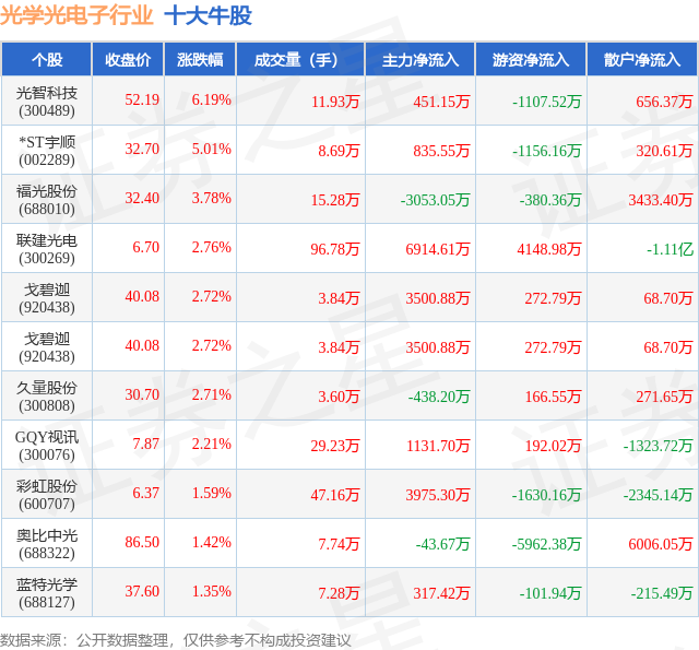 个股表现方面,光学光电子行业当日领涨股为光智科技(300489),该股当日报收52.19,上涨6.19%,成交量11.93万,主力资金净流入451.15万元。*ST宇顺(002289)以上涨5.01%紧随其后,该股当日成交量8.69万,主力资金净流入835.55万元。除此之外,福光股份(688010)、联建光电(300269)、戈碧迦(920438)均进入当日牛股之列。具体个股列表见下表:
